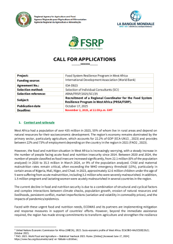 Recrutement D’un(e) Coordonnateur(trice) Régional(e) du Programme de Résilience du Système Alimentaire En Afrique de L'Ouest (PRSA/FSRP)